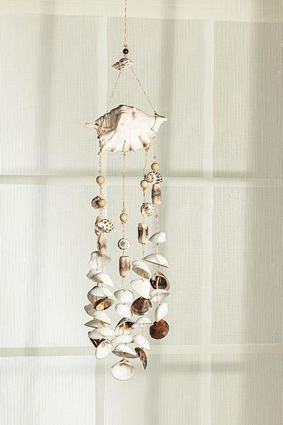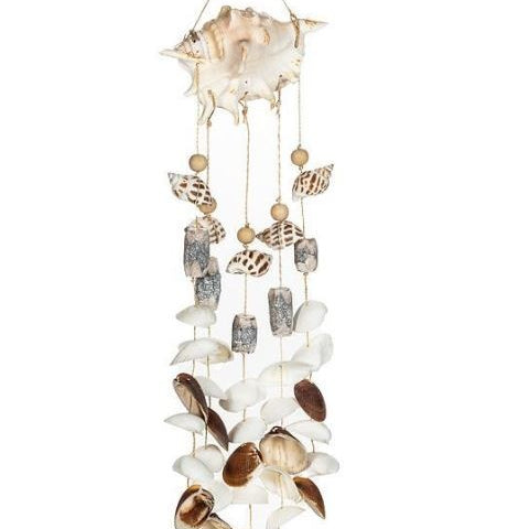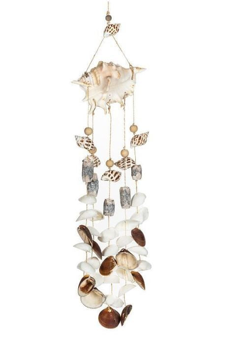 This enchanting 5 Strand Shell Chime will elevate your outdoor space.Crafted with meticulous attention to detail, this wind chime features five delicate strands adorned with a variety of seashells. As the gentle breeze caresses your garden, the soothing, melodic sounds of these shells will transport you to the serene shores of the ocean. Hang it on your porch or in your garden for a touch of coastal charm and auditory delight. Embrace the tranquil ambiance with this beautifully handcrafted wind chime.