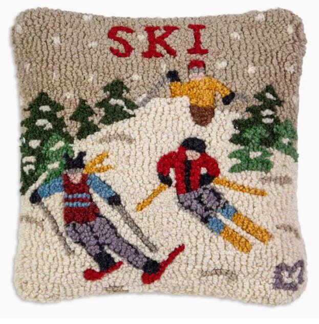 Skiers schuss down snowy slopes, with pine trees lining the path. A pillow to celebrate the sport and its beautiful scenery.