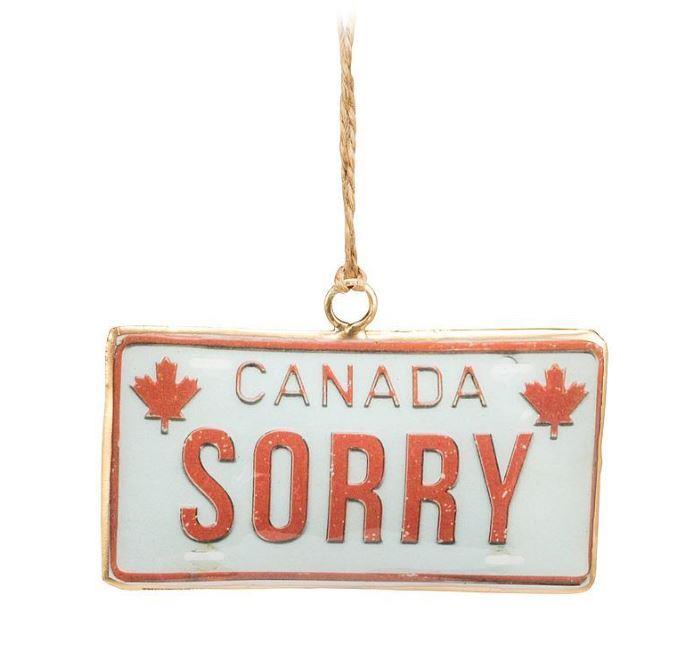 There's nothing more Canadian than apologizing – except for this playful "Sorry" License Plate double-sided Ornament! Crafted out of metal, this ManMade ornament – Canadian artist Doug Jackson's line of products inspired by vintage maps, photographs and Canadiana – features a Canada license plate complete with maple leaves bearing that all-too-common Canuck catchphrase: SORRY. This double-sided ornament also makes for a good apology, as well as fun addition to any Christmas tree. Other ManMade ornaments also available.