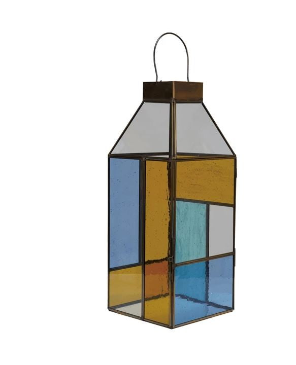 This elegant lantern features clear, blue, and yellow stained glass panels framed in warm copper. With a built-in handle for hanging or tabletop display, it adds a colorful, vintage-inspired glow to any space. Perfect for candles or LED lights.