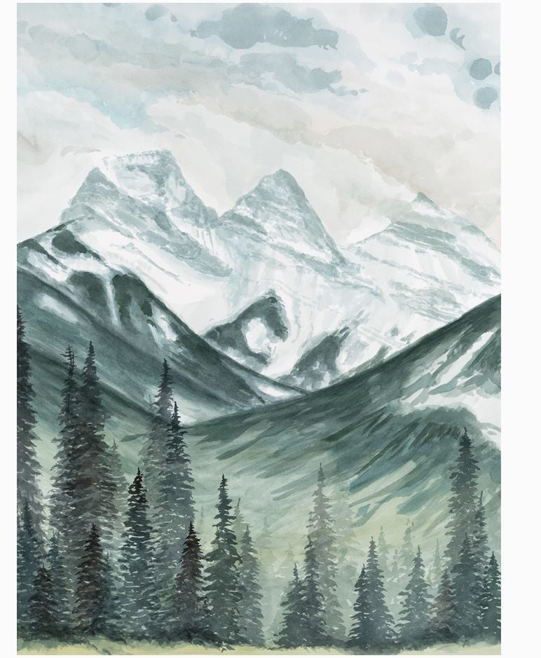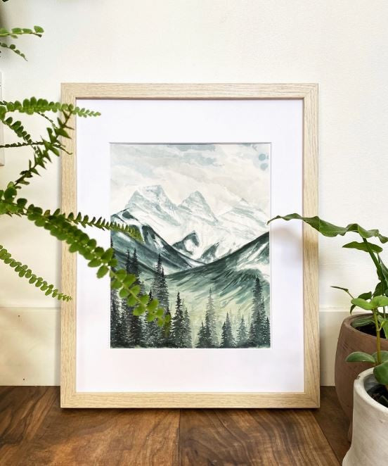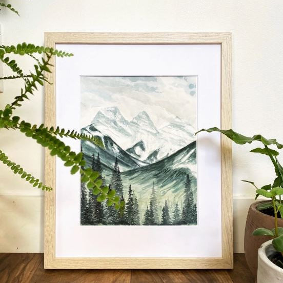The beautiful, iconic mountain range of “Three Sisters” is located in Canmore, Alberta, and is instantly recognized by anyone local. This print captures a natural depth and feeling of vast, towering mountains that welcome you home. Reproduced on beautiful, thick cotton watercolour paper, this giclee print looks and feels just like an original watercolour painting. Each print comes varnished with a wide border. 11" x 14"