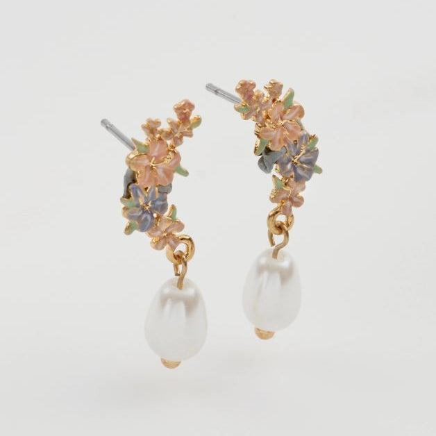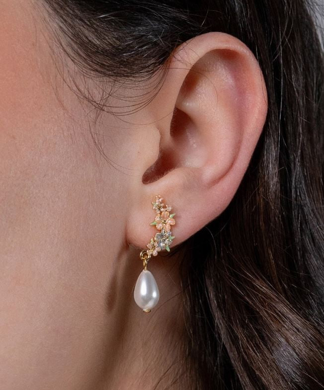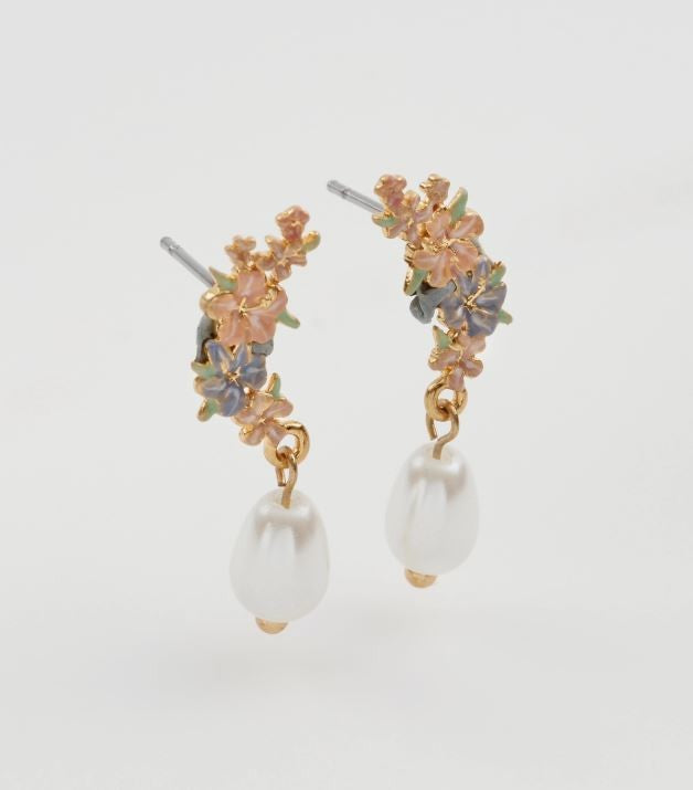 18ct High polish gold plated brass, enamel, pearl; Earring posts: Stainless steel Climber Stud: 11mm height x 13mm width; Charm: 8mm height x 5mm width Wipe clean with