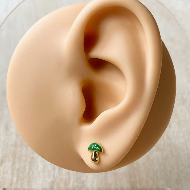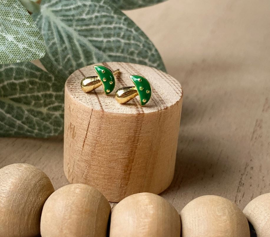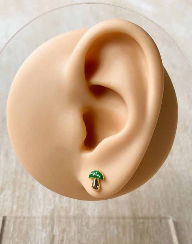 Whimsical and charming, these tiny mushroom stud earrings bring a touch of everyday magic to your look. Featuring a shimmering forest-green cap and a gleaming 14K gold-plated base, they’re lightweight, nickel-free, and perfect for sensitive ears.