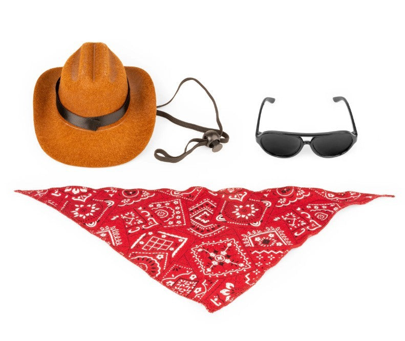 Yeehaw! Western-themed dress up kit includes aviator sunglasses, cowboy hat and bandana. TikTok and Instagram ready!