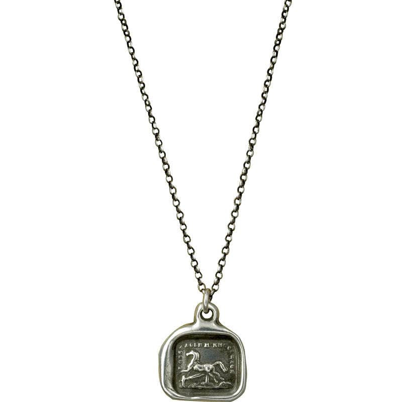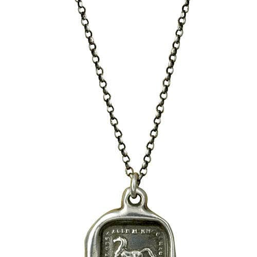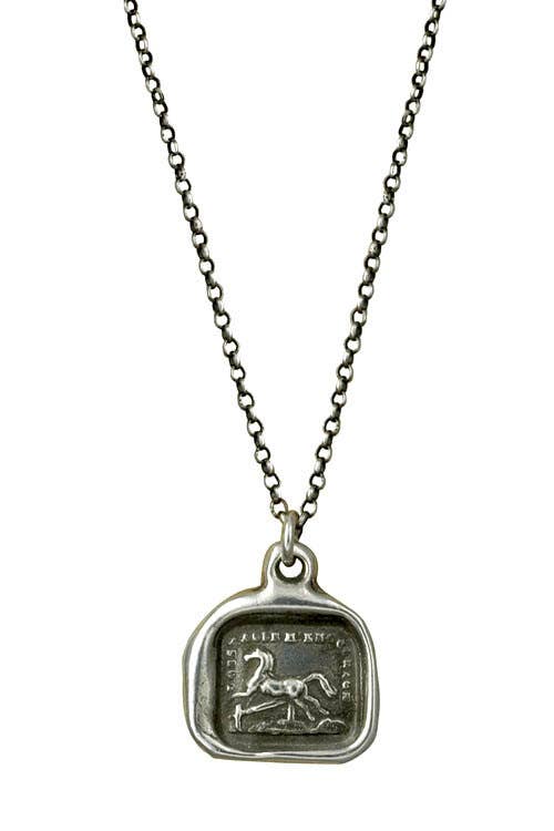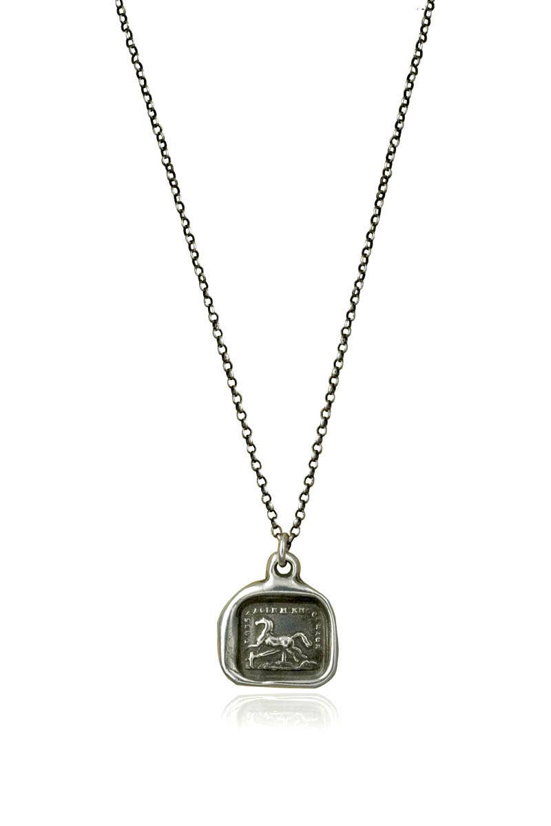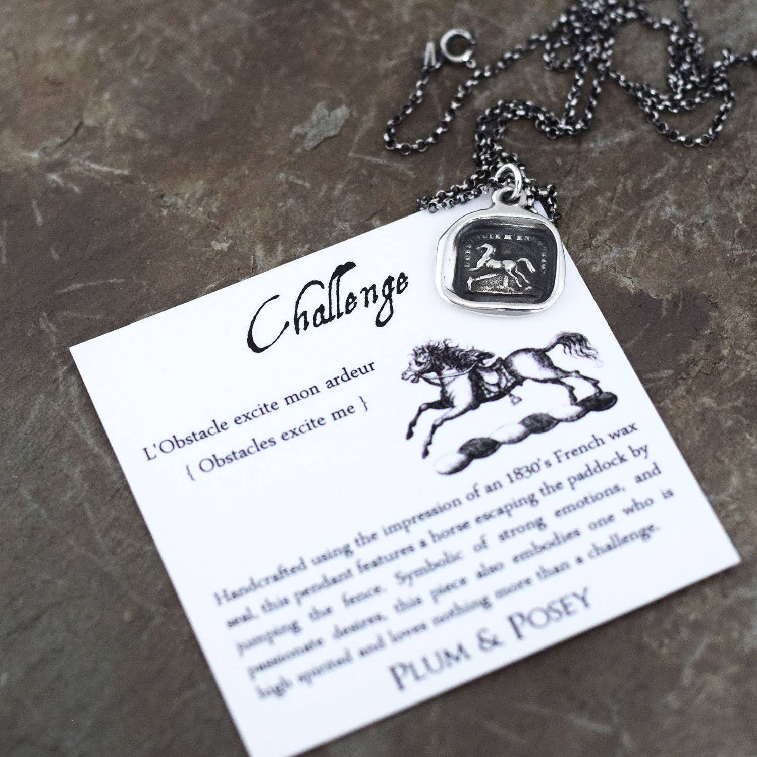 L'obstacle excite mon ardeur { obstacles excite me }. Handcrafted using the impression of an 1830's french wax seal. This pendant features a horse escaping the paddock by jumping the fence. Symbolic of strong emotions, and passionate desires, this piece also embodies one who is high spirited and loves nothing more than a challenge. Materials: sterling silver.