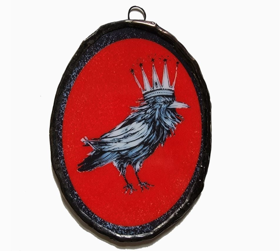 This is the King of Crows, an original illustration hand-enameled onto translucent white glass, finished in a pewter edge with hanger. Perfect for wall or window!
