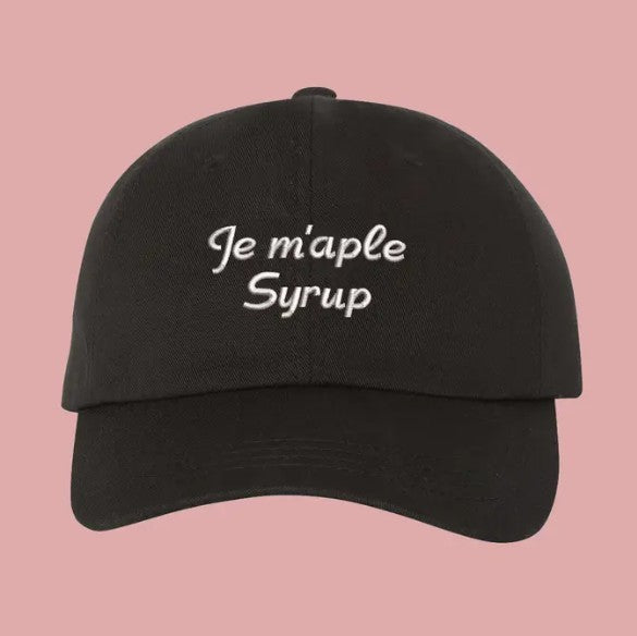This stylish hat features a unique "Je M'aple Syrup" embroidered design, showcasing a playful nod to Canadian culture. Crafted from 100% cotton, it offers a comfortable and breathable fit for all-day wear. The adjustable buckle back ensures a perfect fit for most head sizes, while the high-quality embroidery adds a touch of authenticity and craftsmanship. Proudly embroidered in Canada, this hat is the perfect blend of fashion and heritage, making it a must-have accessory for anyone who loves Canada and its iconic maple syrup.