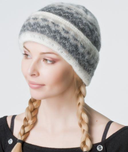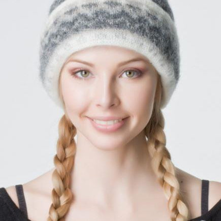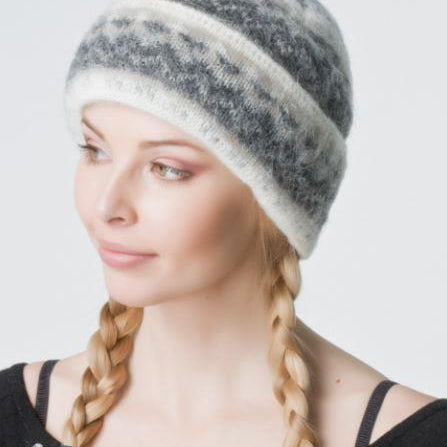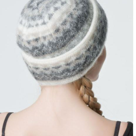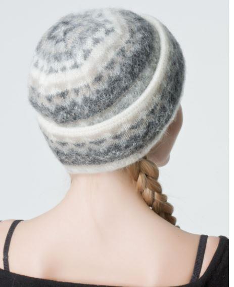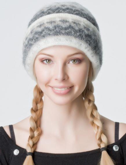 Patterned wool double-cuff Wool Toque. Pattern colors: grey, beige and white. Traditional Icelandic design.