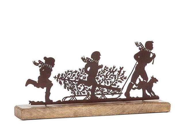 Add a captivating, rustic scene to your holiday decor with this delightful Tree Cutting Scene with Kids. Crafted out of metal and wood, this evocative scene rendered in dark-brown silhouette on a solid wood base features a trio of children and their dog triumphantly pulling a Christmas tree home on their sled for a fun and festive complement to mantles, counters, decorative displays and more.