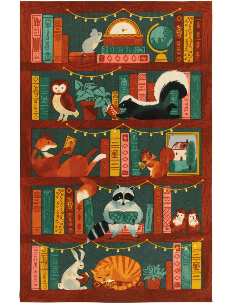 Add life and character to your kitchen with our fun and colorful printed Book Club woven cotton dishtowel. A perfect combination of form and function, this towel will make washing up less of a chore. Join these lit-loving creatures in their snuggly nook, curl up in a chair, and enjoy a good book.