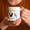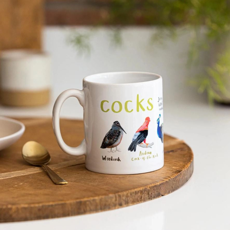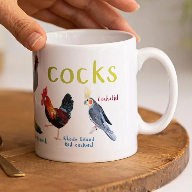 A ceramic mug featuring a selection of birds. The design includes six colourful birds from around the world, such as peacocks, cockerels and parrots. It is the ideal gift for nature buffs, fowl fans and pun loving folks on the farm.