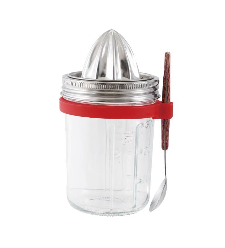 This 10 oz. glass jar is a handy all-in-one kitchen tool, featuring a stainless steel juicer lid, measurement markings, a silicone ring with built-in spoon holder, and a matching spoon. Perfect for juicing, mixing, and serving with ease and style.