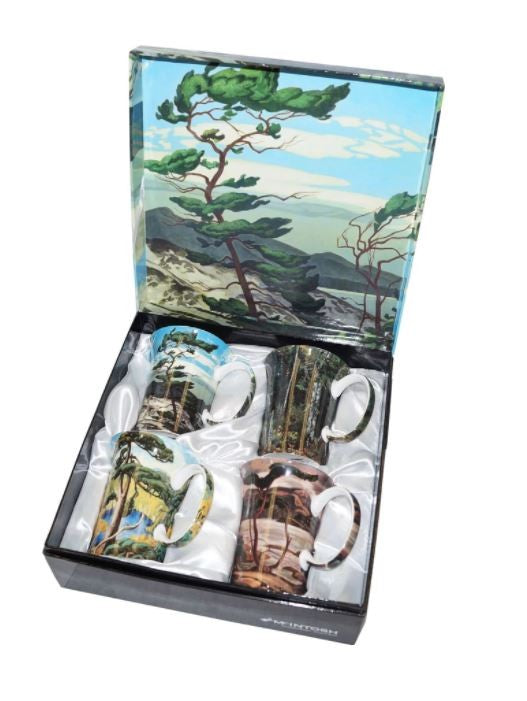 Bring a piece of Canadian artwork into your home with this beautiful set of 4 fine bone china mugs. The set depicts four different artworks by the Group of Seven, a group of Canadian landscape artists from 1920 to 1933. The four paintings include: A.J. Casson - “White Pine”, A.Y. Jackson - “Bent Pine”, Frank Johnston - “Sunset in the Bush”, and Arthur Lismer - “Bright Land”. The mugs are elegant, durable, lightweight and easy to clean, they are made for everyday use.