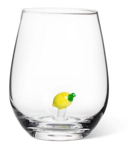 Enhance your sipping experience with our Stemless Glass featuring a lemon at the bottom. The icon at the base adds a whimsical and sweet accent to the modern stemless design.