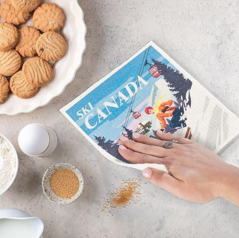 These biodegradable European-made and PRC-printed dishcloths are as durable as they are eco-friendly — featuring an iconic Ski Canada design. Our digitally printed dishcloths will help with your washing and cleaning. Ultra-absorbent, each machine-washable cloth replaces up to 15 rolls of paper towel, and lasts for up to 12 months. Perfect for the home, office or cottage.