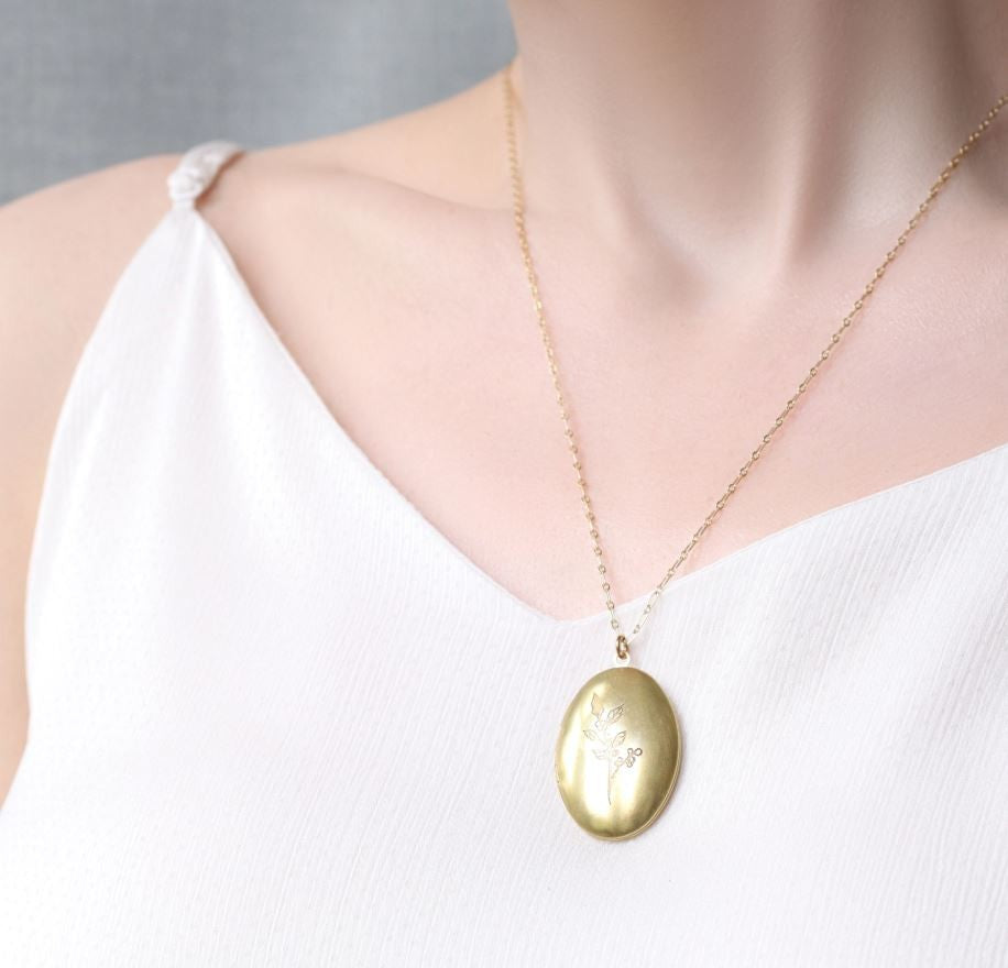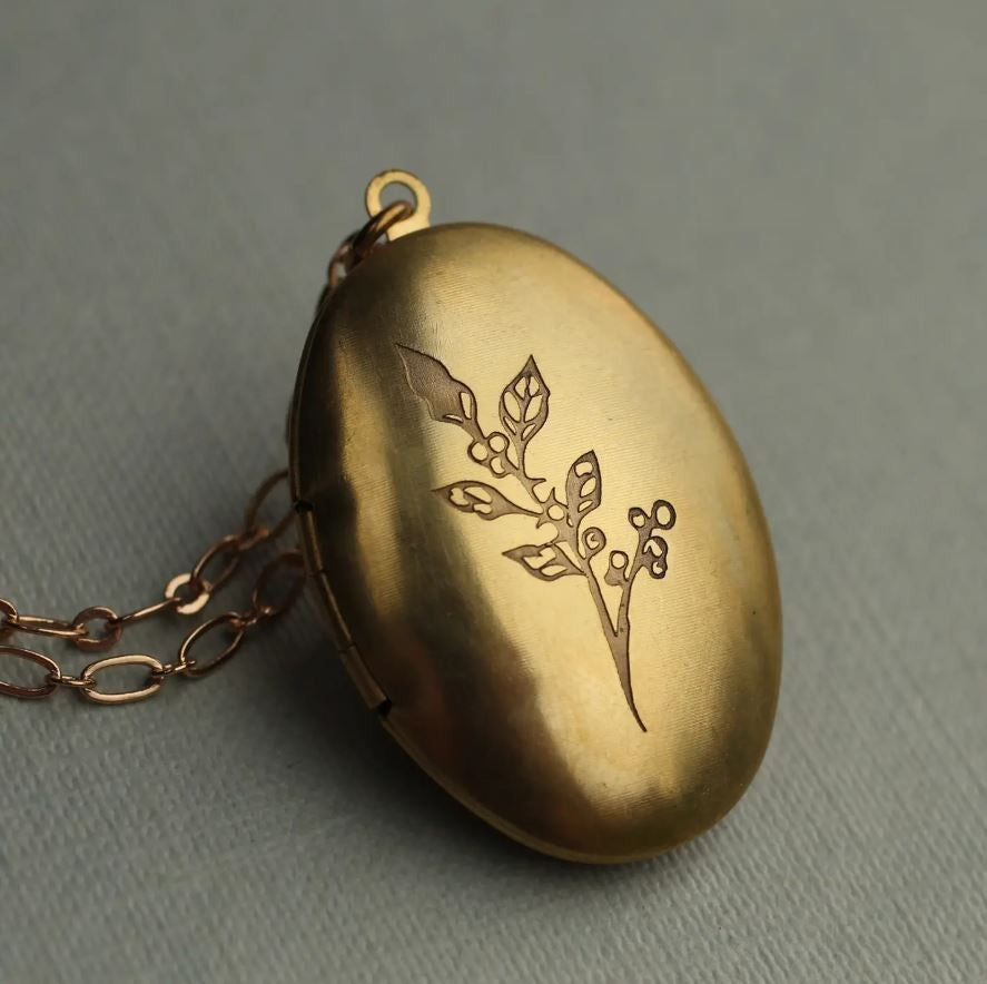 This delicate botanical locket features a finely engraved holly design, capturing the timeless beauty of nature in a wearable keepsake. With its subtle detailing and vintage-inspired form, it’s perfect for holding a cherished photo or small memento close to your heart.