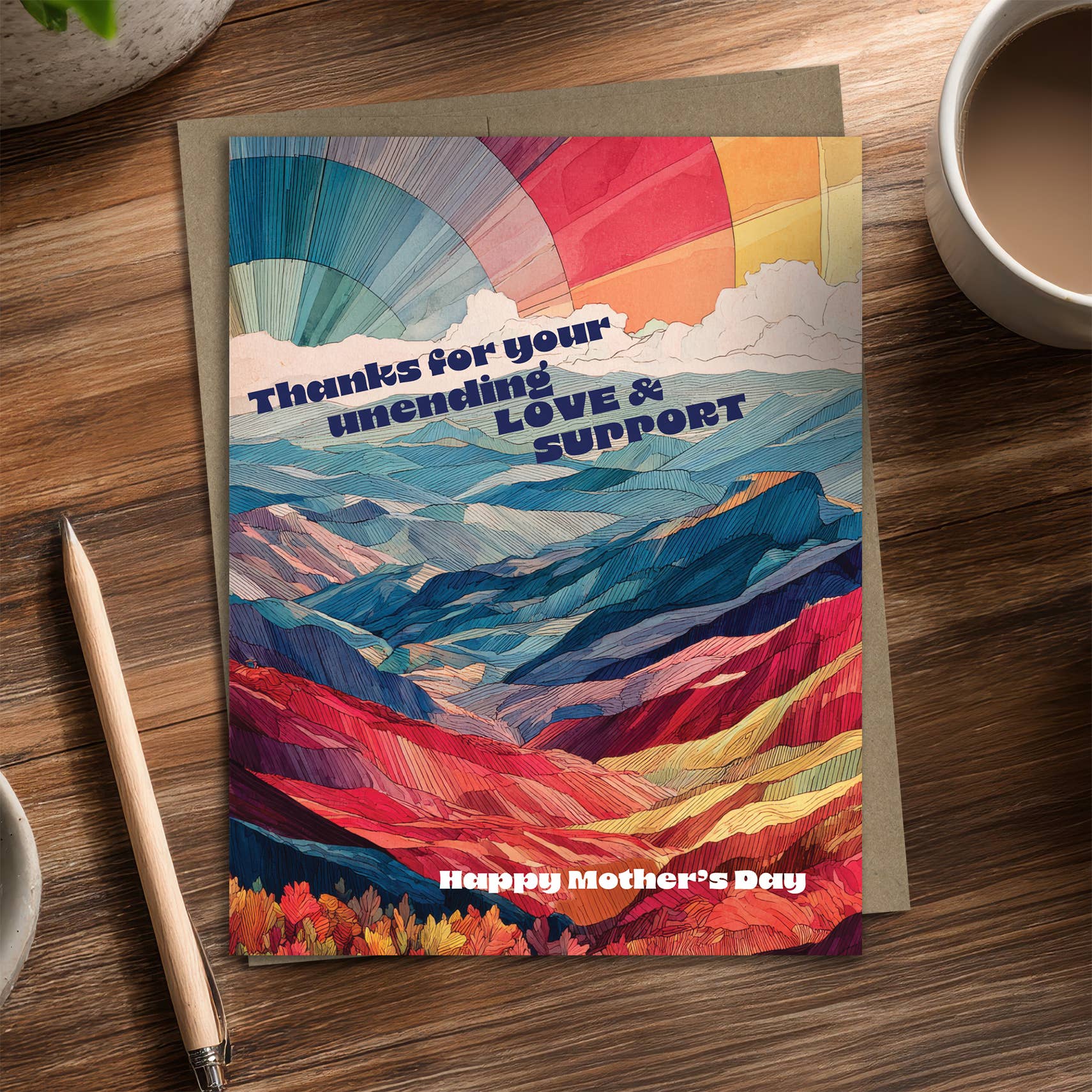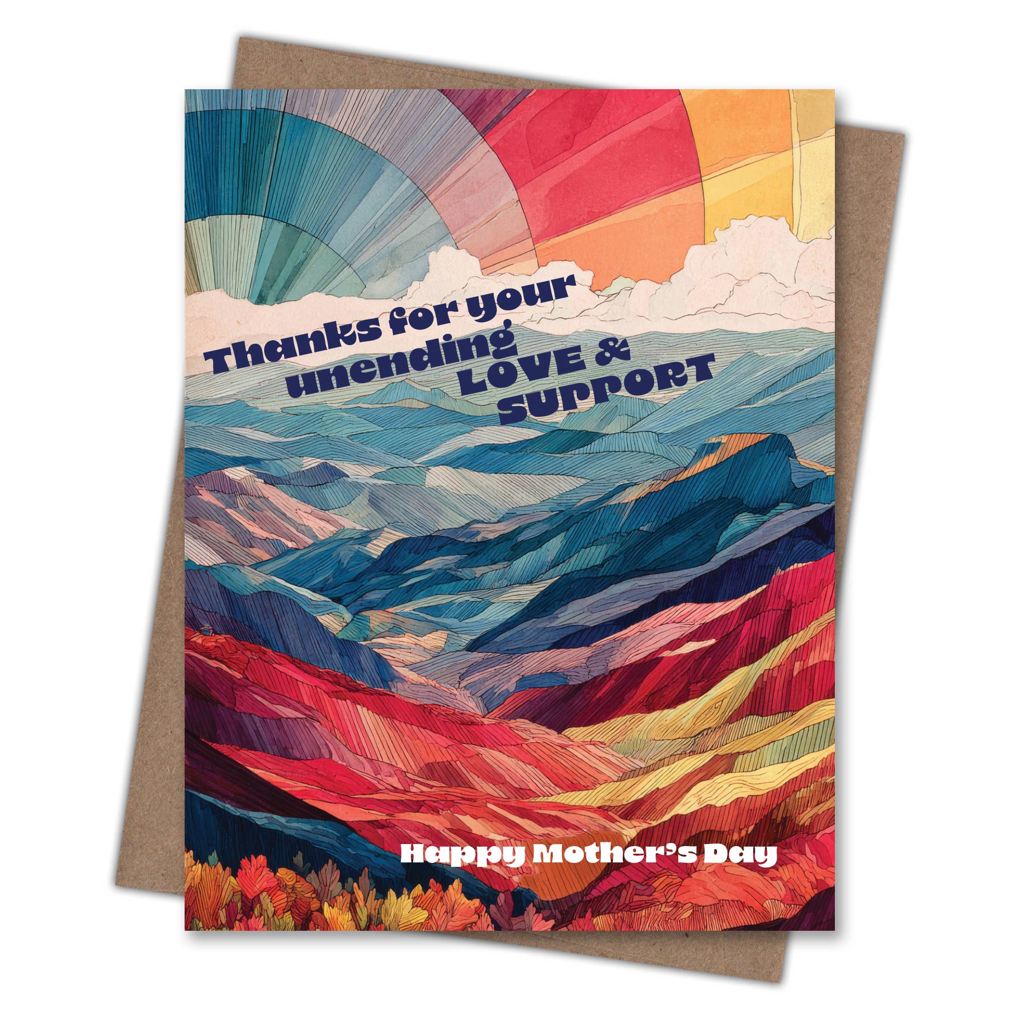 Celebrate Mom’s constant love with this radiant mountain landscape filled with flowing colors and soft sky gradients. Printed in full color on heavyweight, 100% post-consumer recycled paper. Each Waterknot greeting card includes a 100% recycled kraft envelope and recyclable clear sleeve. Blank inside for your personal message. Size: 4.25 in x 5.5 in.