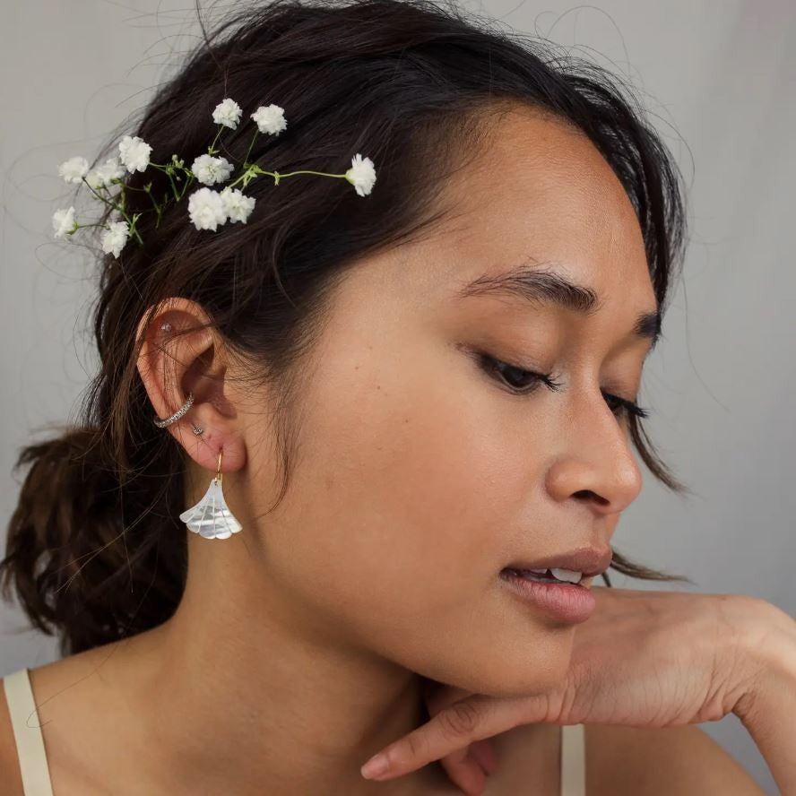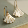 These beautiful Art Deco earrings are pure Mother of Pearl which has been carved into a simple scalloped fan shape. The pearl has an incredible sheen and take on a subtle glow when they catch the light.
