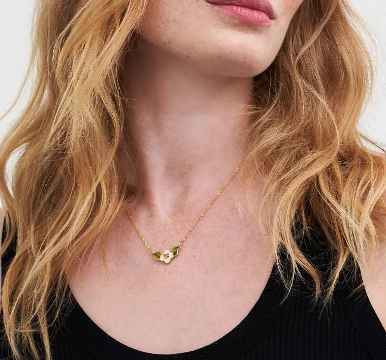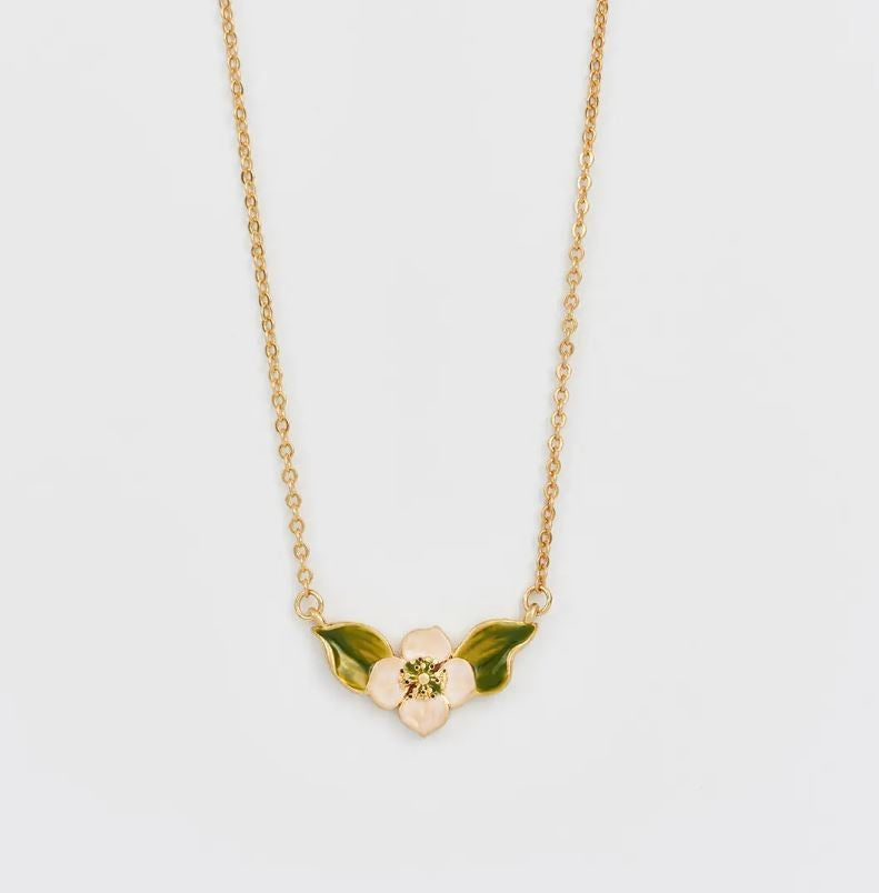 Delicate as a whisper on the breeze, the Poppy Anemone Necklace brings a touch of woodland poetry to your everyday style. Inspired by the quiet beauty of moonlit clearings and wild blossoms swaying beneath the stars, this necklace captures a moment of nature's stillness and grace. A soft white anemone blooms between two hand-painted green leaves, gently nestled on a vintage-style gold chain. Crafted in 22ct worn gold-plated brass with detailed enamel work, this floral necklace is a subtle yet striking piece - perfect for layering or wearing solo as a symbol of serenity, resilience, and natural charm.