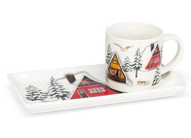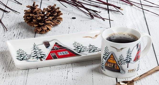 Add some wintry, rustic style to your holidays with this evocative Winter Cabins Mug. Crafted out of Bone China, this white mug features a variety of beautifully painted winter cabins amidst a snowy landscape complete with toboggan and snowy owl to complement any hot beverage.