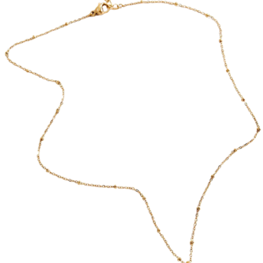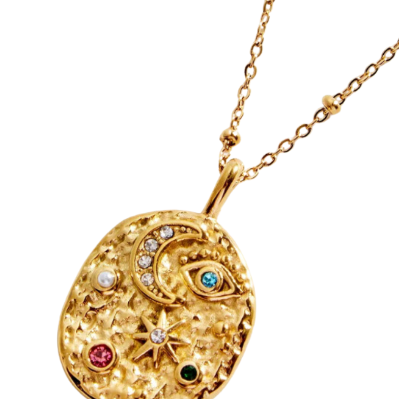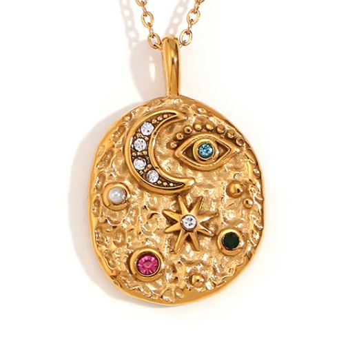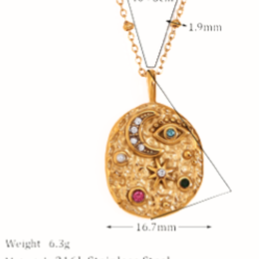 Each stone is hand set bezel. The eye, moon and star are carved out. Curb Steel Chain 16" with 2" extender 1" drop Pendant Lobster claw clasp Evil Eye, Moon, Star, Pearl, Planet, Universe