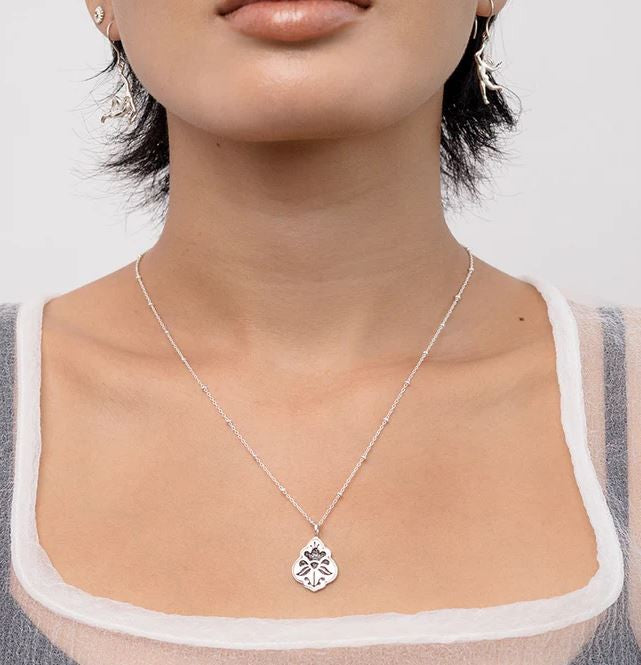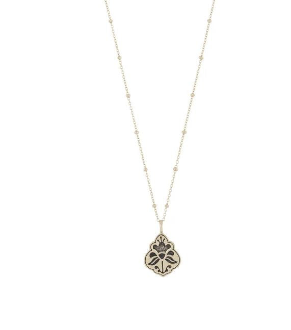 This double-sided necklace is a reminder to persevere, explore, and be the best you. Decorated with botanical motifs, it's a timeless piece great for layering.