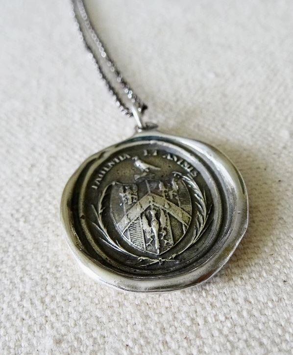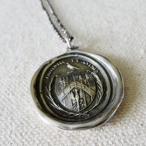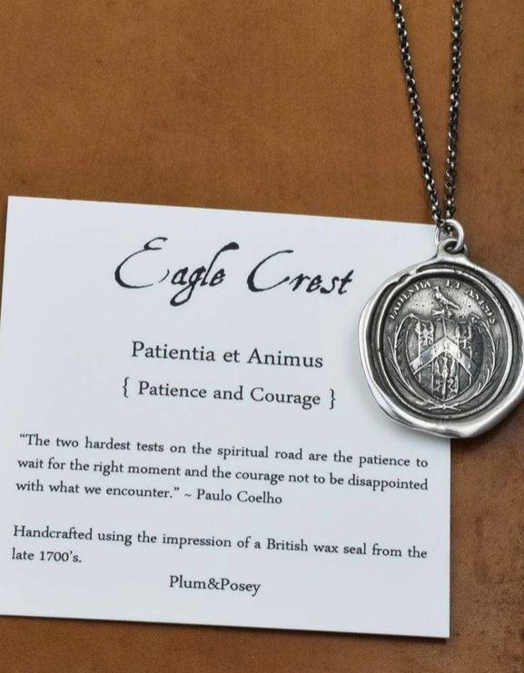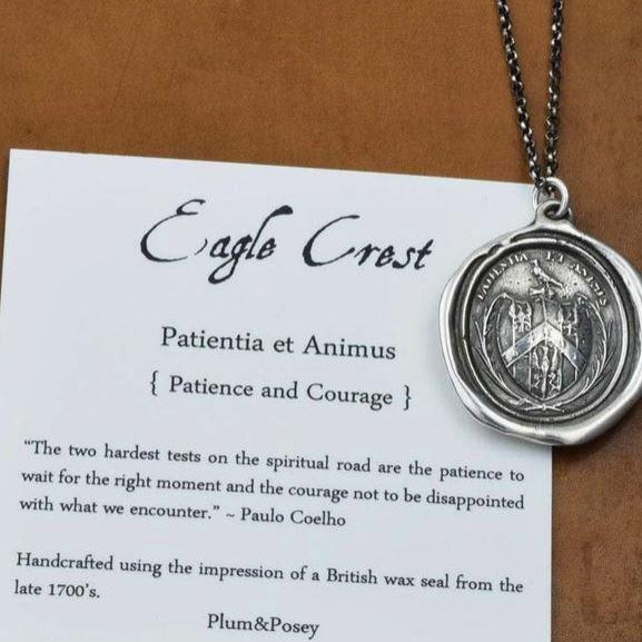 Eagle Crest ~ Patientia et Animus {Patience and Courage} 'The two hardest tests on the spiritual road are the patience to wait for the right moment and the courage not to be disappointed with what we encounter.' - Paulo coelho Handcrafted using the impression of a British wax seal from the late 1700's. Materials: sterling silver. Size: 1" x 1 1/8" (26mm x 30mm).