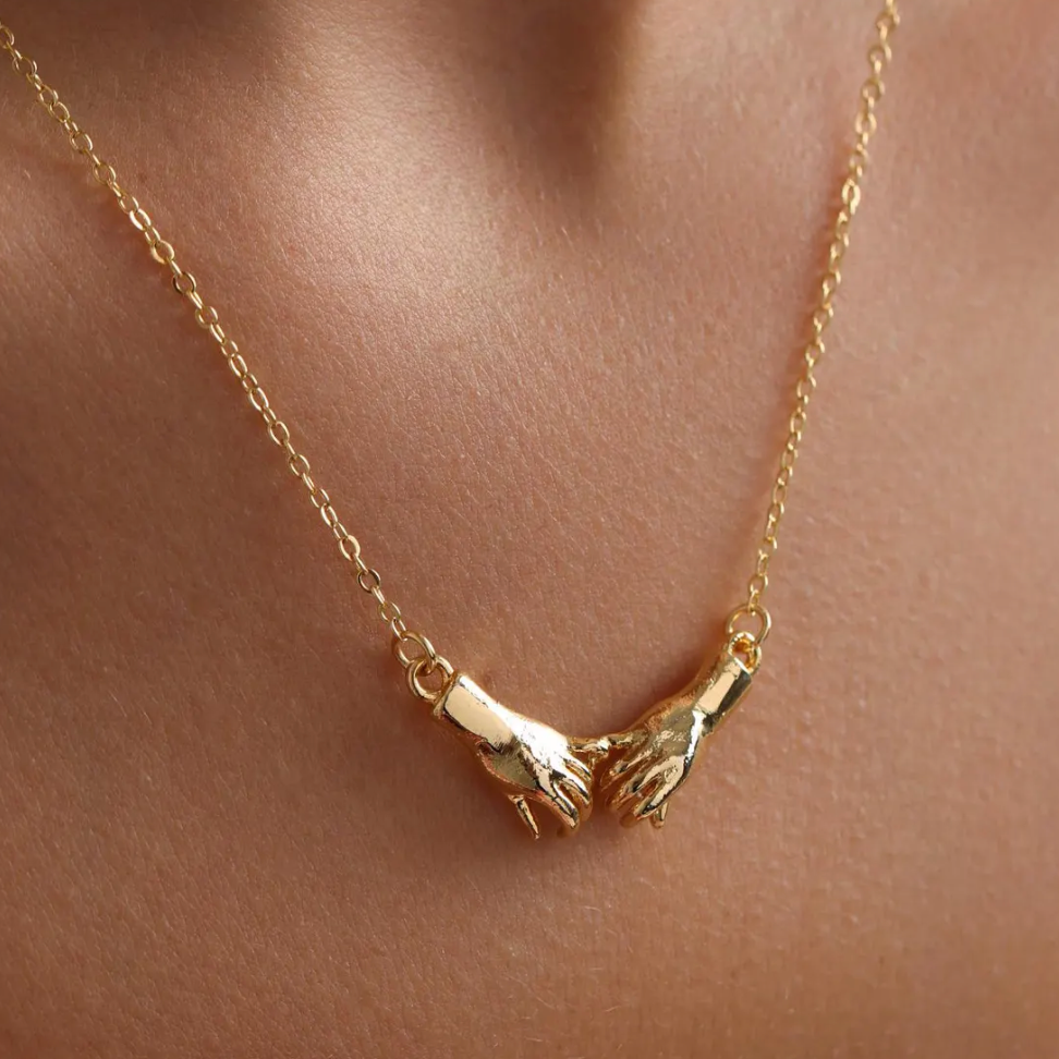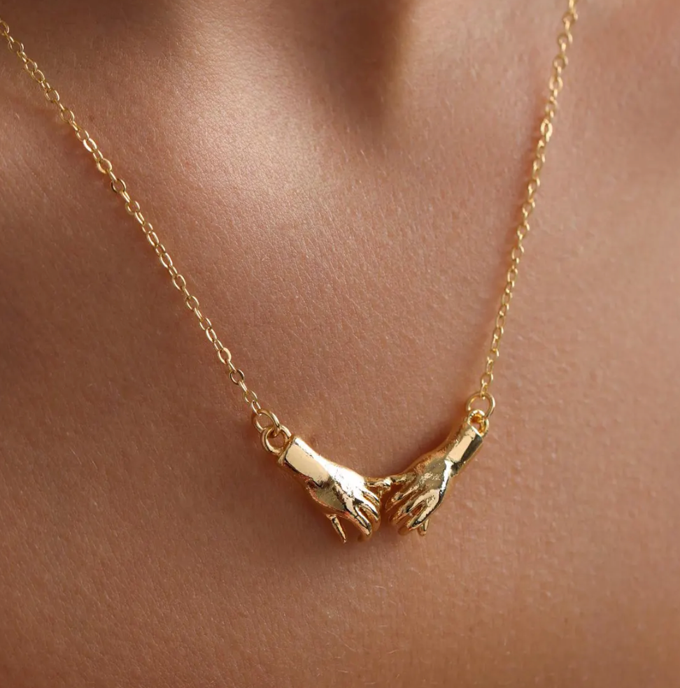 On the neck it is a detailed pendant of two hands touching pinky fingers. Articulated