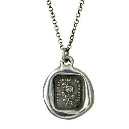 Handcrafted using the impression of an 1830’s French wax seal. This pendant features a butterfly feeding from the nectar of a rosebud. In doing so, this ensures the roses continued existence through pollination. They sustain one another. Butterflies symbolize the psyche or the soul, while roses imply true and pure love.