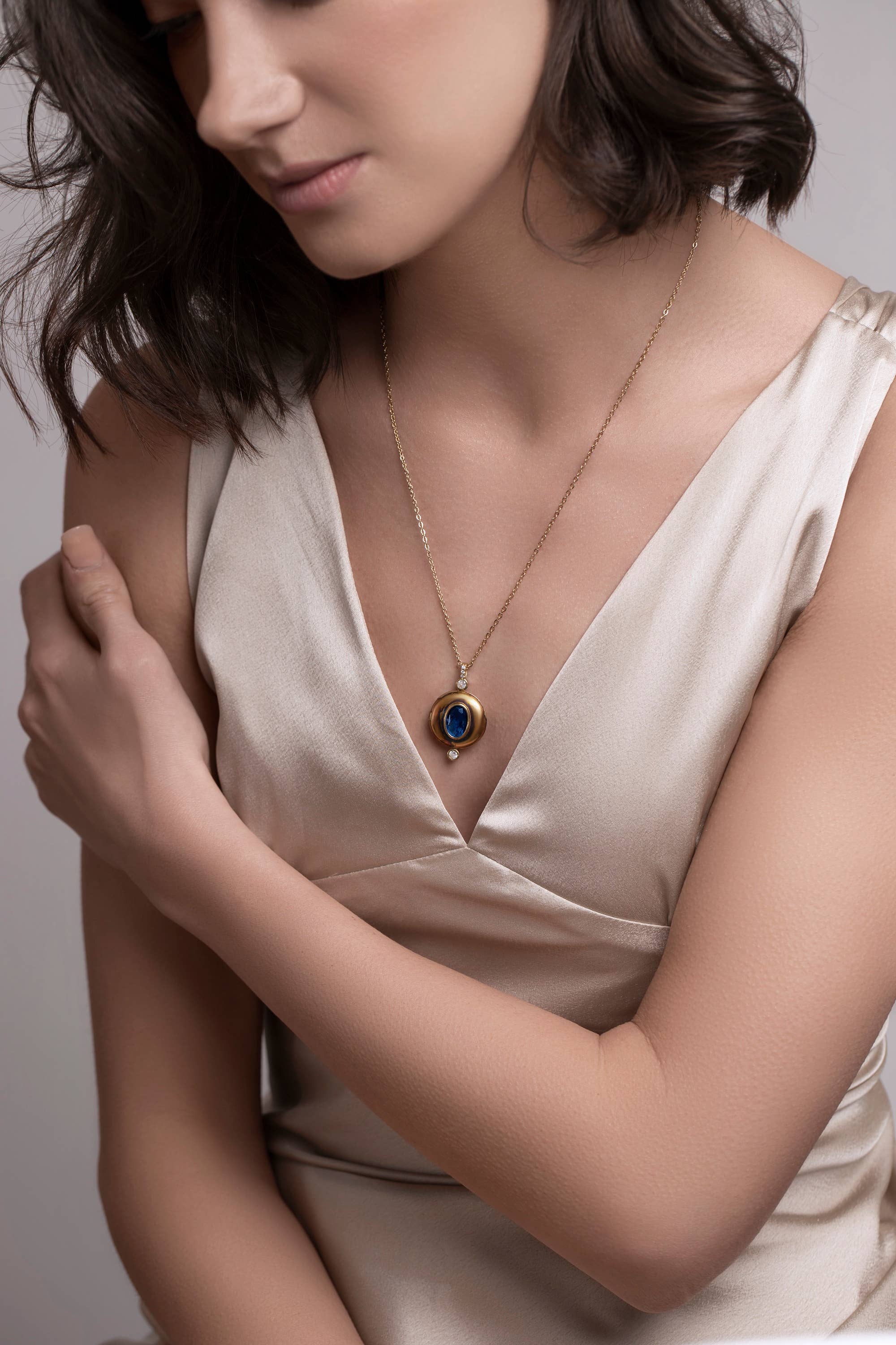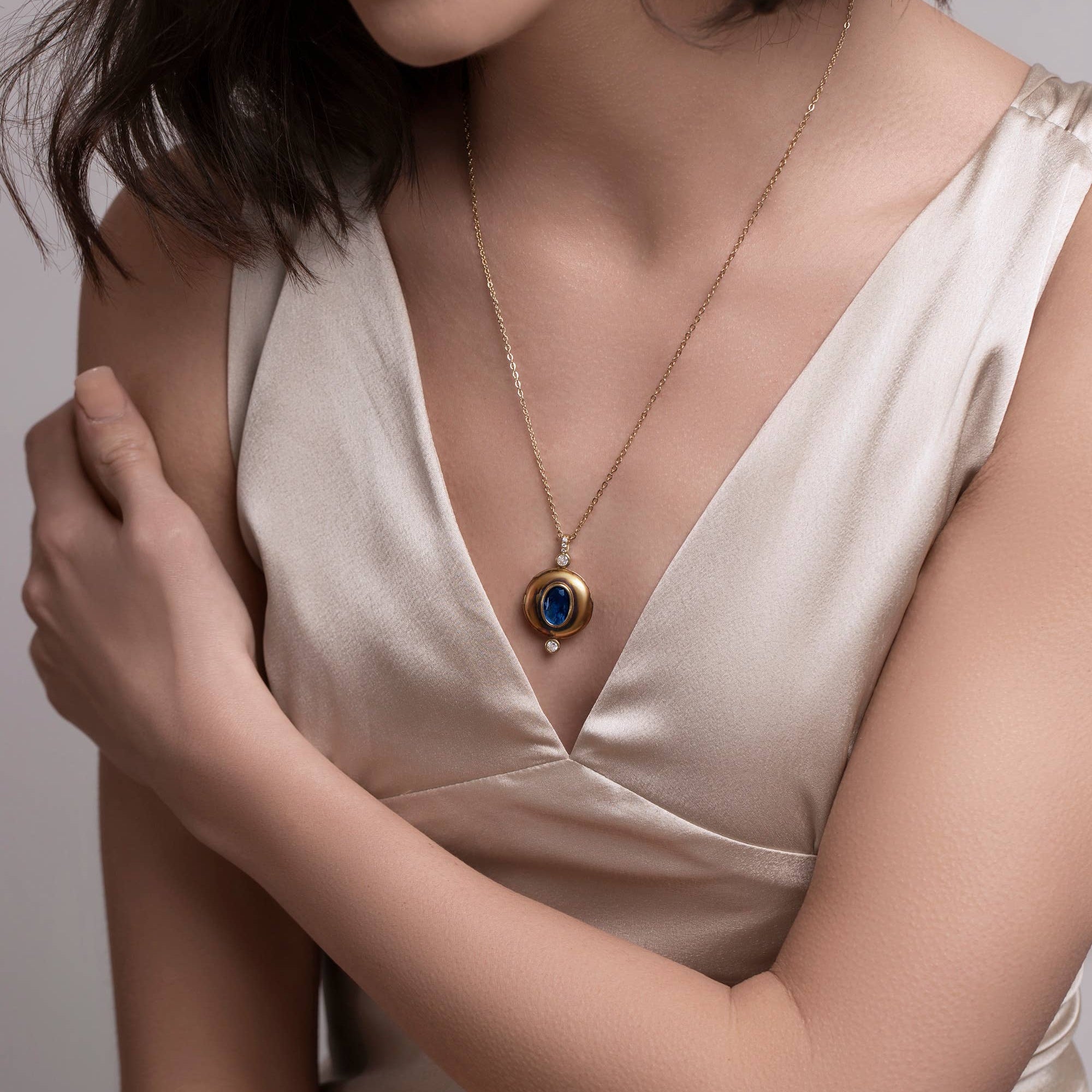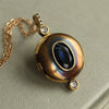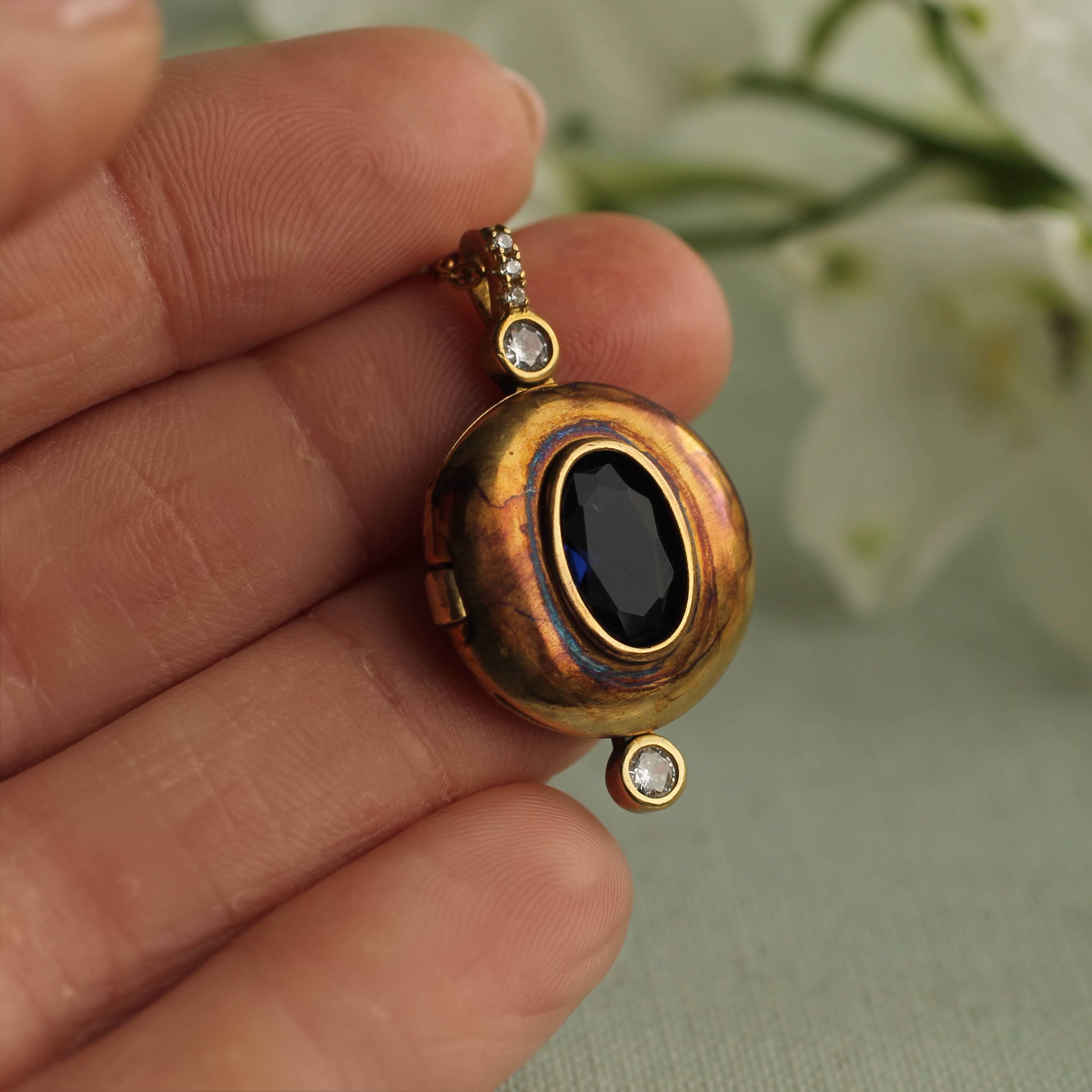 This beautiful, Art Deco personalized locket necklace features a deep navy sapphire glass jewel set into the centre, with two tiny accent crystals above and below. The solid brass has a beautiful, antique patina with an incredible iridescence when it catches the light.