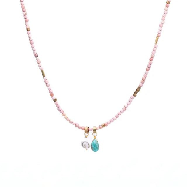 The Shala Necklace is perfect for layering or as that simple, everyday necklace that goes with everything. With removable gemstone & shiva shell drop charms.