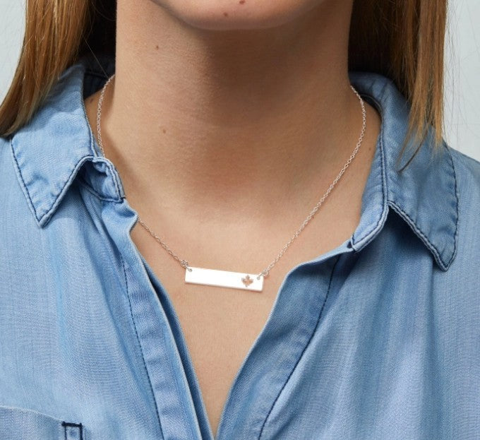 Show your love for Canada with the iconic maple leaf symbol carved out from a classic bar necklace. A subtle touch to keep your Canadian pride close to your heart. Designed and made in Canada. This Maple Leaf Bar Necklace is made from fine pewter and plated in 14 karat gold or silver. We stand behind our quality and pride ourselves in the workmanship that goes into each piece. By producing locally, we keep jobs at home and can guarantee that our jewelry is made in a positive work environment. Available in Gold and Silver Size: 1.5” X 0.5” | 17" Chain