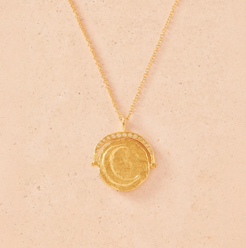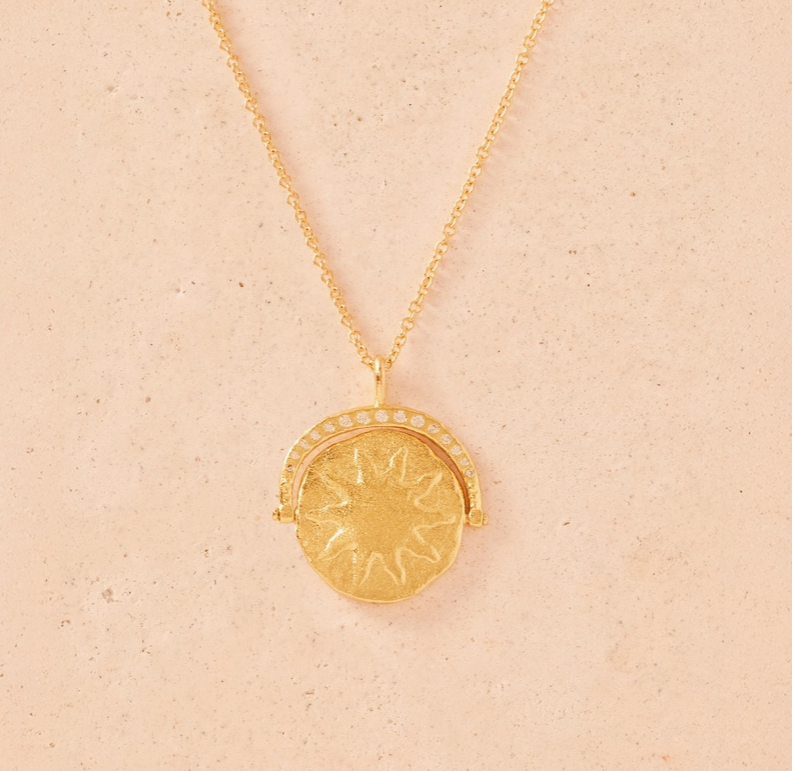 Day and night, light and dark, masculine and feminine – linked by a band of star-like inlaid gems, the Sirius rotating round pendant captures the harmony of opposites.