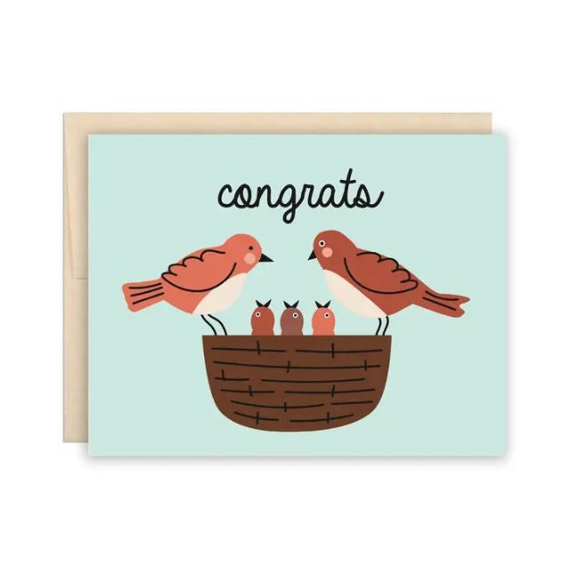 Celebrate life's most heartwarming moments with this charming card featuring two proud birds admiring their tiny nestlings. Whether it’s a new baby, a growing family, or any joyful new beginning, this card says “Congrats” in the most tender way.