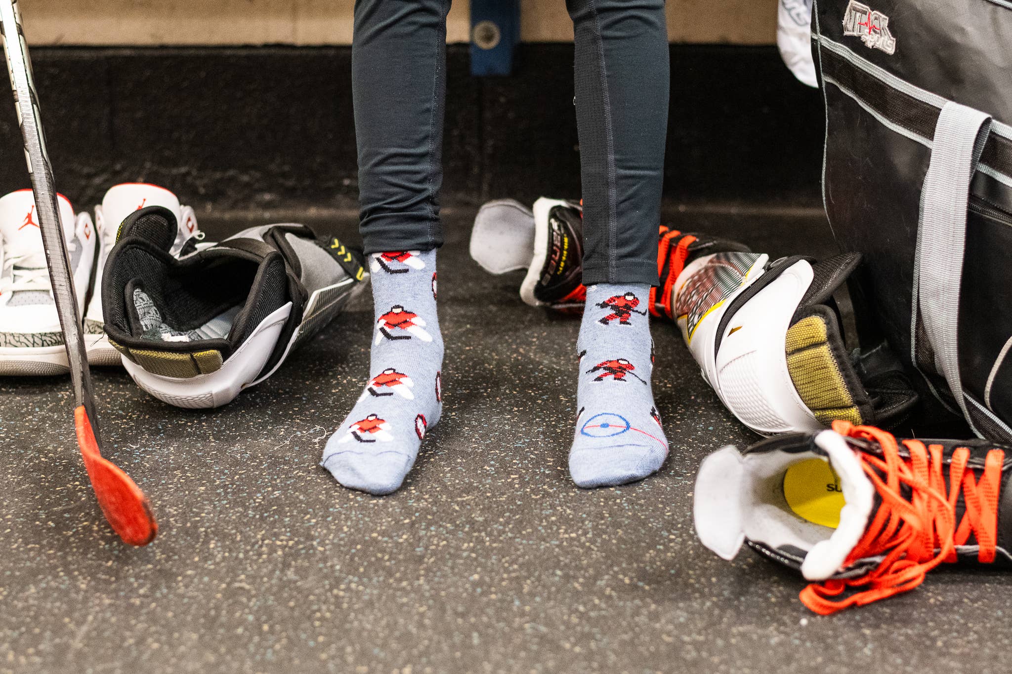 Game On! For the little hockey fan who eats, sleeps, and breathes the game! These mismatched hockey socks bring the action to their feet—because every day is a good day for a hat trick.