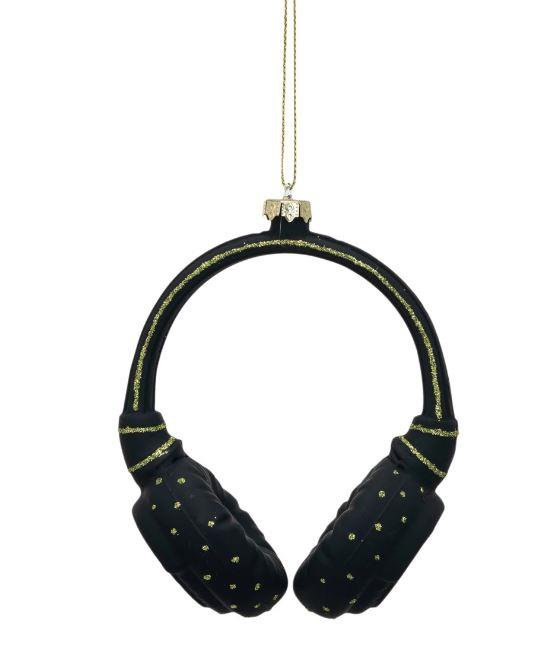 This glass and resin headphones ornament is a nod to audiophiles and the holiday season. Clad in black with touches of green glitter, it's a visual representation of the joy music brings, ready to adorn any tree with a bit of rhythm and sparkle. The ornament measures 3.5 inches in length and 4.5 inches in height, sized to stand out on any festive fir. This is a perfect choice for anyone who loves whimsical and adorable holiday decor. A glass and resin ornament shaped like headphones, sparkling with green glitter against a sleek black backdrop. An ornament that hits the high note of style, perfect for music lovers and contemporary holiday themes. Suited for hanging on the Christmas tree or decorating a music enthusiast's space.