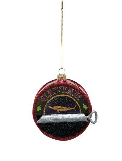 This ornament is a glass depiction of caviar in a can, hand-painted with precision and sprinkled with glitter to capture the allure of this delicacy. It measures 3.25 inches in length, 1.75 inches in width, and 4 inches in height, offering a perfect size for visibility without overwhelming the tree.