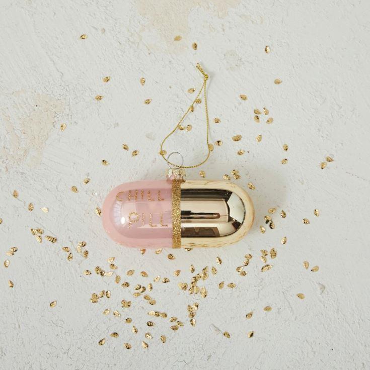 4"L x 1-3/4"W x 2"H Glass "Chill Pill" Ornament w/ Glitter, Pink & Gold Finish