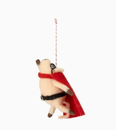 Felt flying pig super hero ornament, pink pig with black mask and red cape, 4.5 in.