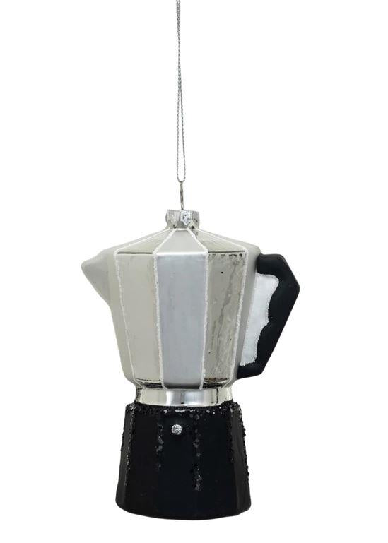 This ornament is a glass rendition of an espresso pot, complete with a black and silver finish that adds a touch of sophistication to its design. It measures 3.25 inches long, 2.5 inches wide, and 4.75 inches high, offering a substantial and elegant representation of coffee culture. The string attachment allows for easy display, making it a perfect gift for espresso enthusiasts or a delightful treat for any holiday decor. This is a perfect choice for anyone who loves graceful and elegant home decor. A glass espresso pot ornament, boasting a sleek black and silver finish, reflecting the refined taste of coffee aficionados. An ornament that brings a touch of modern elegance to any holiday decor, perfect for a contemporary or minimalist aesthetic. Perfect for adding a chic coffeehouse vibe to the Christmas tree or as a stylish accent in a kitchen display.