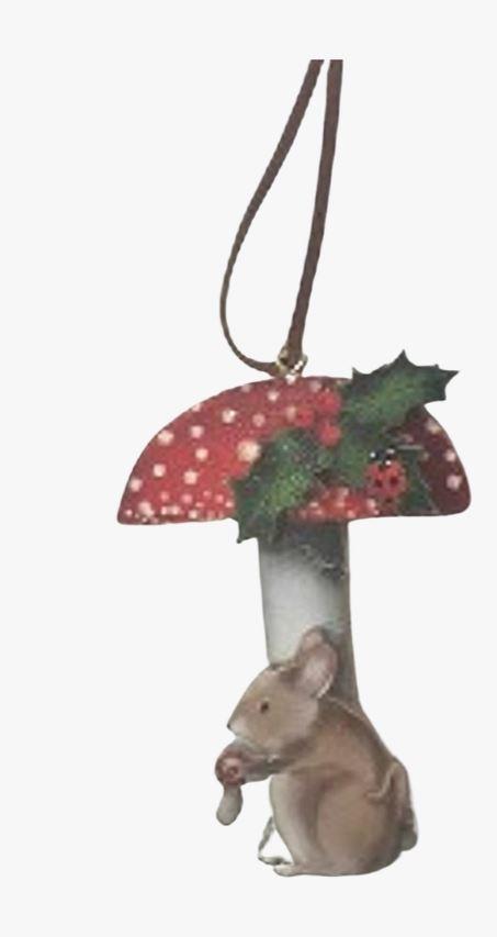 Add this woodland mushroom ornament to your whimisical holiday decor, featuring a wooden mushroom with a mouse.