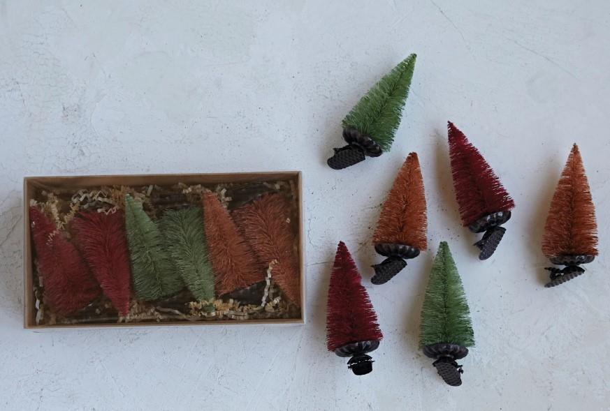 2" Round x 3-3/4"H Sisal Bottle Brush Tree Clip-on Ornaments, Multi Color, Boxed Set of 6