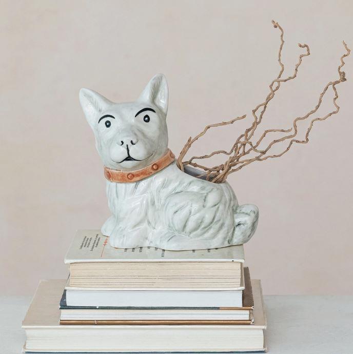 This Vintage Reproduction Scotty Dog Planter is a tribute to timeless design and whimsy. Each planter, with its distinctive crackle glaze and charming color scheme, offers a unique variation that makes it a personal piece for the owner. The playful shape and compact size make it an ideal home for small plants or as a standalone piece that sparks conversation and smiles. It measures 7 inches in length, 4.25 inches in width, and 6.25 inches in height, perfect for adding character to any room. Whether placed in a farmhouse kitchen, a rustic living room, or a boho bedroom, this planter adds a touch of heartwarming nostalgia and crafted beauty to the home. Its durable stoneware construction ensures it will be a cherished item for years to come.