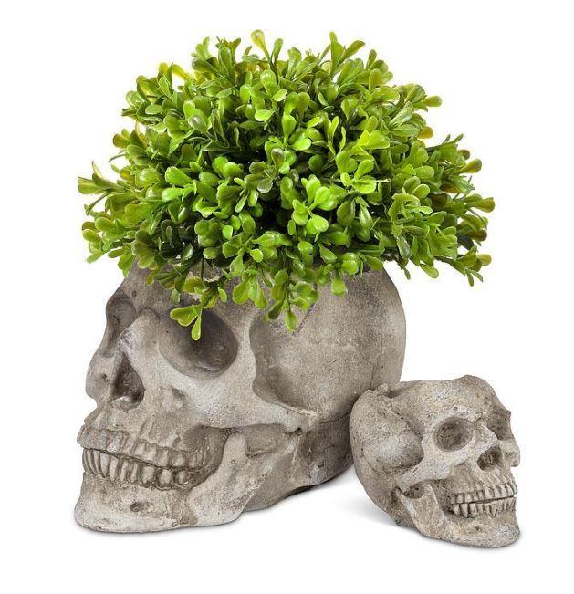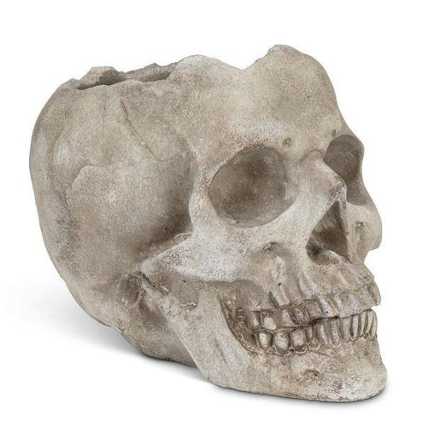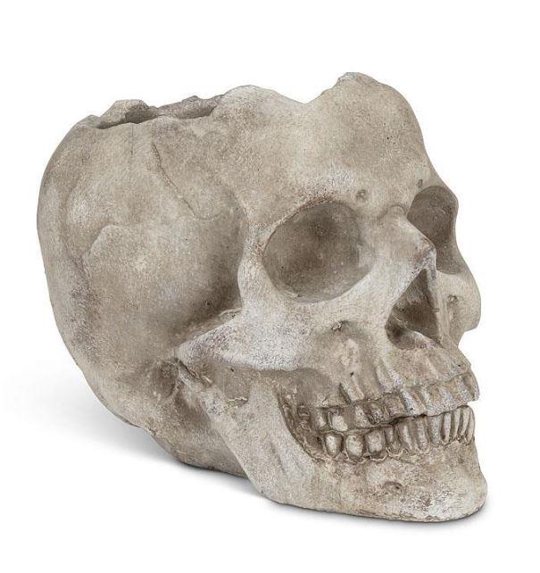 Add a delightfully spooky touch to your decor with this life-like Large Skull Planter. Crafted out of cement, this grey planter is sculpted with lots of rich texture and detail for a fun and frightful complement to the brightest of flowers or blooms.