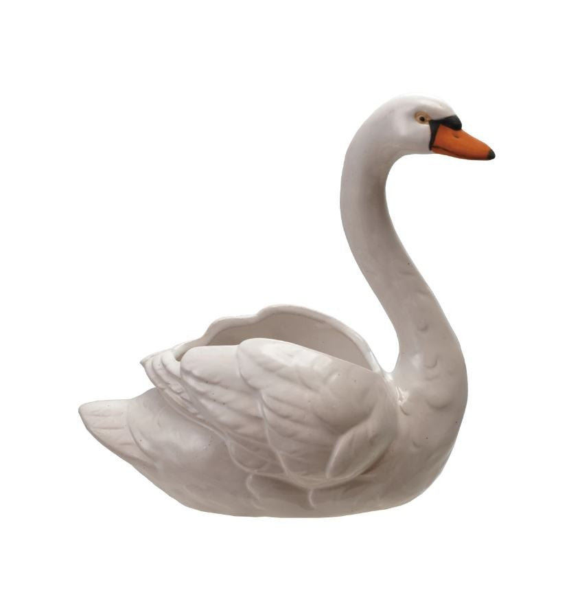 Stoneware Swan Shaped Planter – 6-3/4"L x 4"W x 7-1/4"H, White, Orange & Black