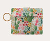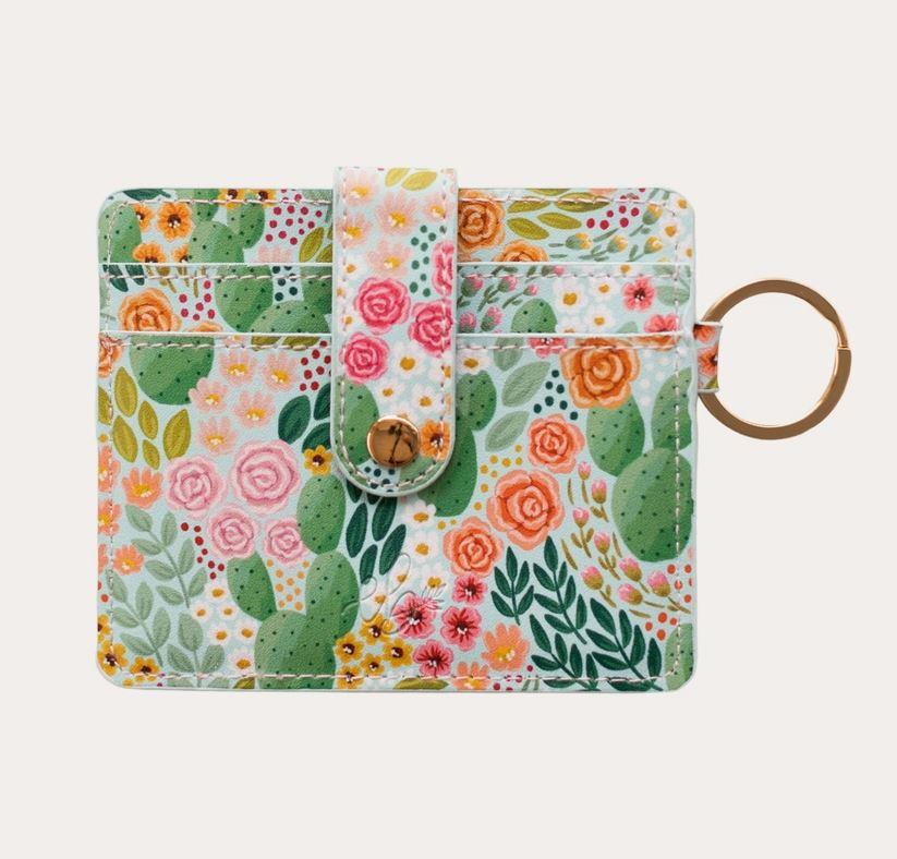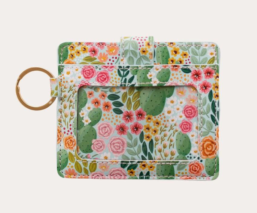 Has 2 card/cash slots with clear plastic slot for an ID. Wallet is 3.5x4.5 inches.