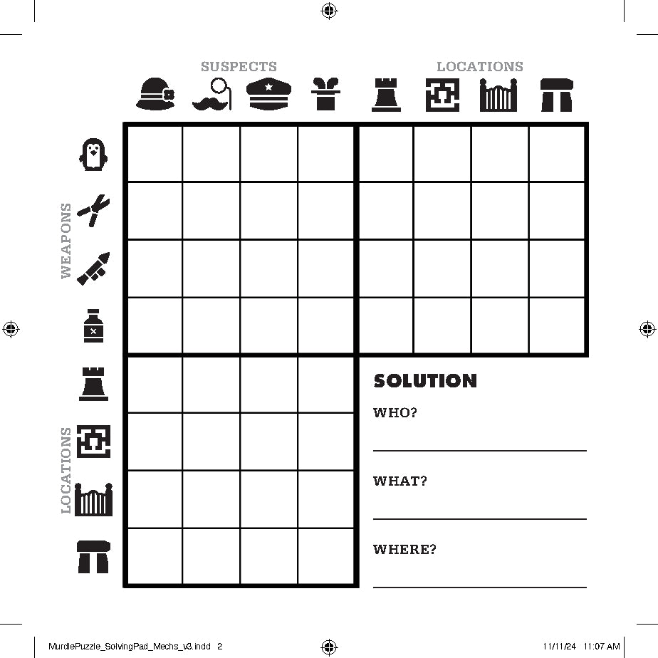 To play, open the puzzle box to find a Murdle story and logic puzzle printed inside, complete with clues, suspects, weapons, and locations. Detectives must assemble the jigsaw puzzle without a full image to guide them, use the logic grids in their detective notebook to evaluate the evidence, and solve the maze within the puzzle image to solve the crime.