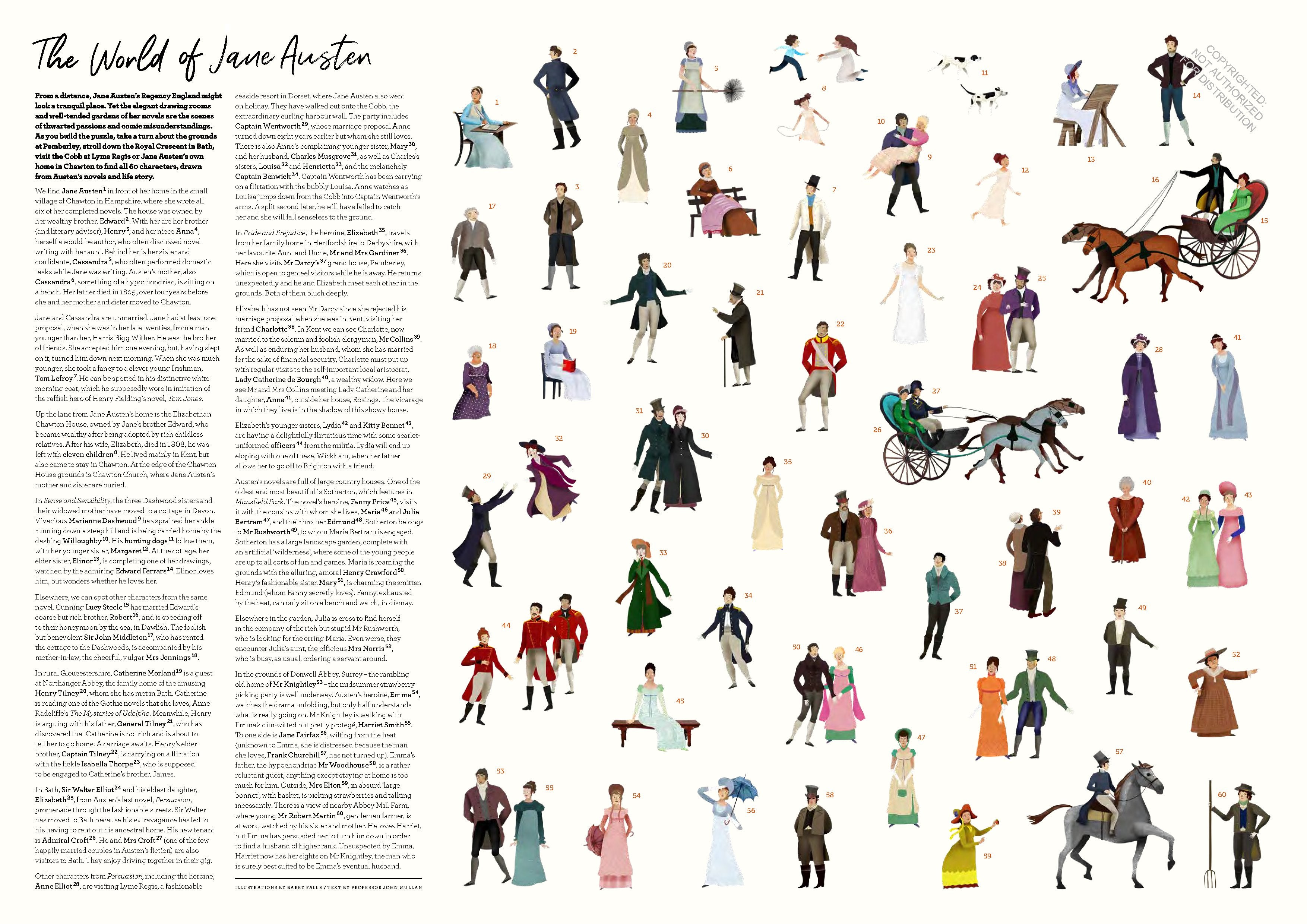 1000 PIECE PUZZLE This 1000-piece puzzle reimagines Austen's life and scenes from her six novels in glorious detail. -CAST OF CHARACTERS Spot famous fictional characters, fellow writers and historical characters as you build the puzzle. -INCLUDES PULL-OUT POSTER Includes educational poster with fun facts about Austen's life and work. Piece together the world of Jane Austen in this exciting jigsaw inspired by the life and works of the prolific author. The perfect challenge for fans of Austen - or anyone who loves a good jigsaw. Featuring a wide cast of Austen's contemporaries and characters, take a tour of Austen's world from the rolling hills of Derbyshire, via Hampshire and Lyme Regis, to the golden stone of the Bath skyline as your build this puzzle.