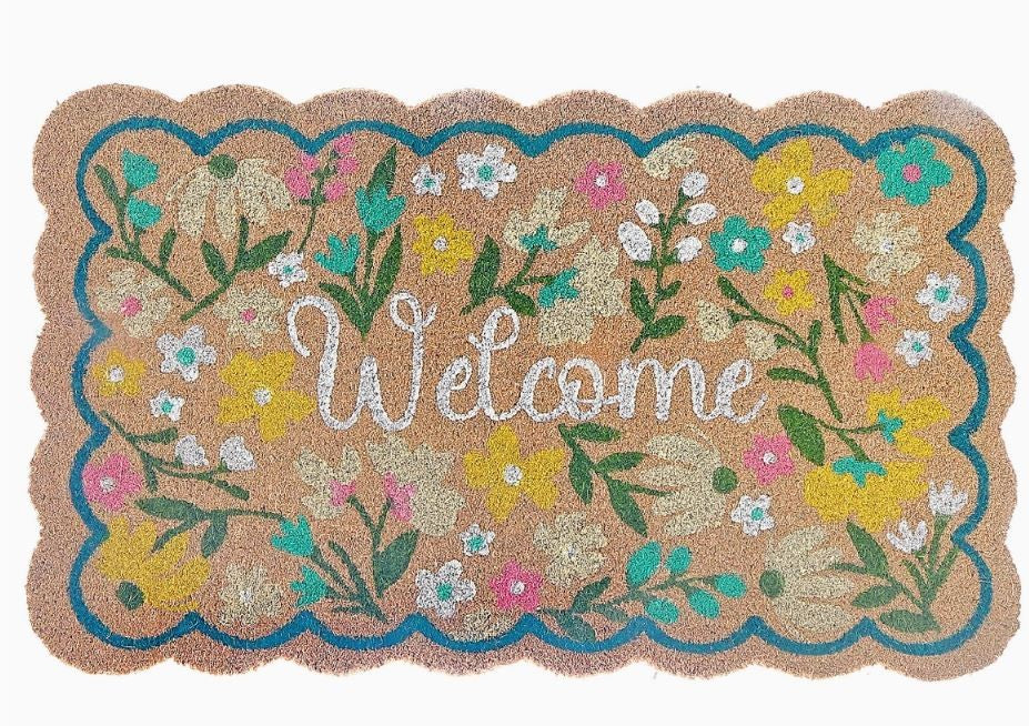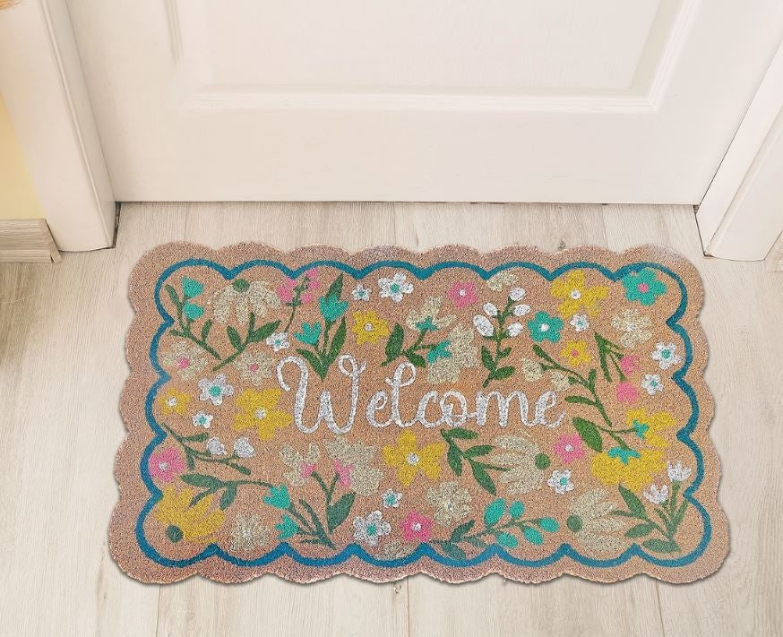 Welcome guests with the charming scallop shaped flowers coir matting, featuring a beautifully scalloped design and floral pattern that brings a warm, inviting touch to any entryway. Crafted from durable coir material, this stylish outdoor mat offers both elegance and functionality, making it a perfect addition to any doorstep. The natural texture of coir effectively traps dirt and debris, keeping your home cleaner and enhancing its curb appeal. Features: The scallop shape of this coir mat, combined with a floral Welcome design, adds a touch of sophistication and French-inspired charm, welcoming guests with style. Material: Made from natural coir fiber, known for its durability and natural ability to trap dirt, ensuring a clean entrance while enhancing decor.