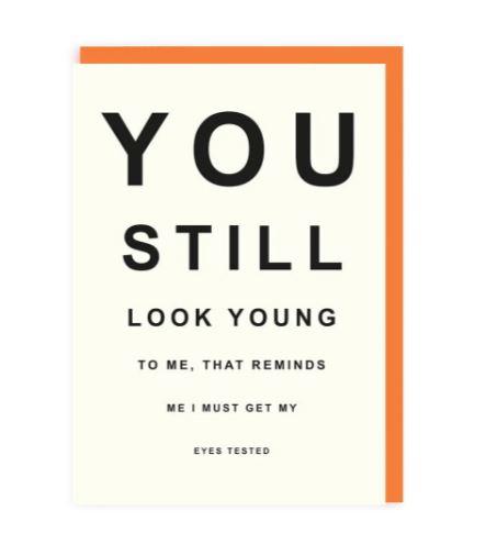 The front of this Birthday Card reads "You Still Look Young To Me, that reminds me I must get your eyes tested." The greeting card is blank on the inside for your message.